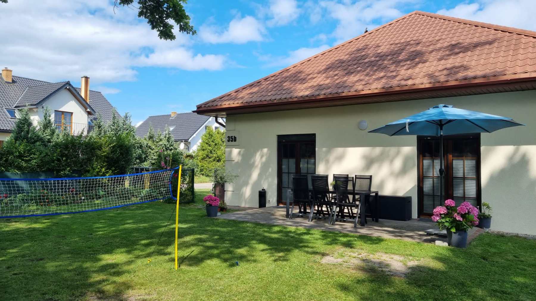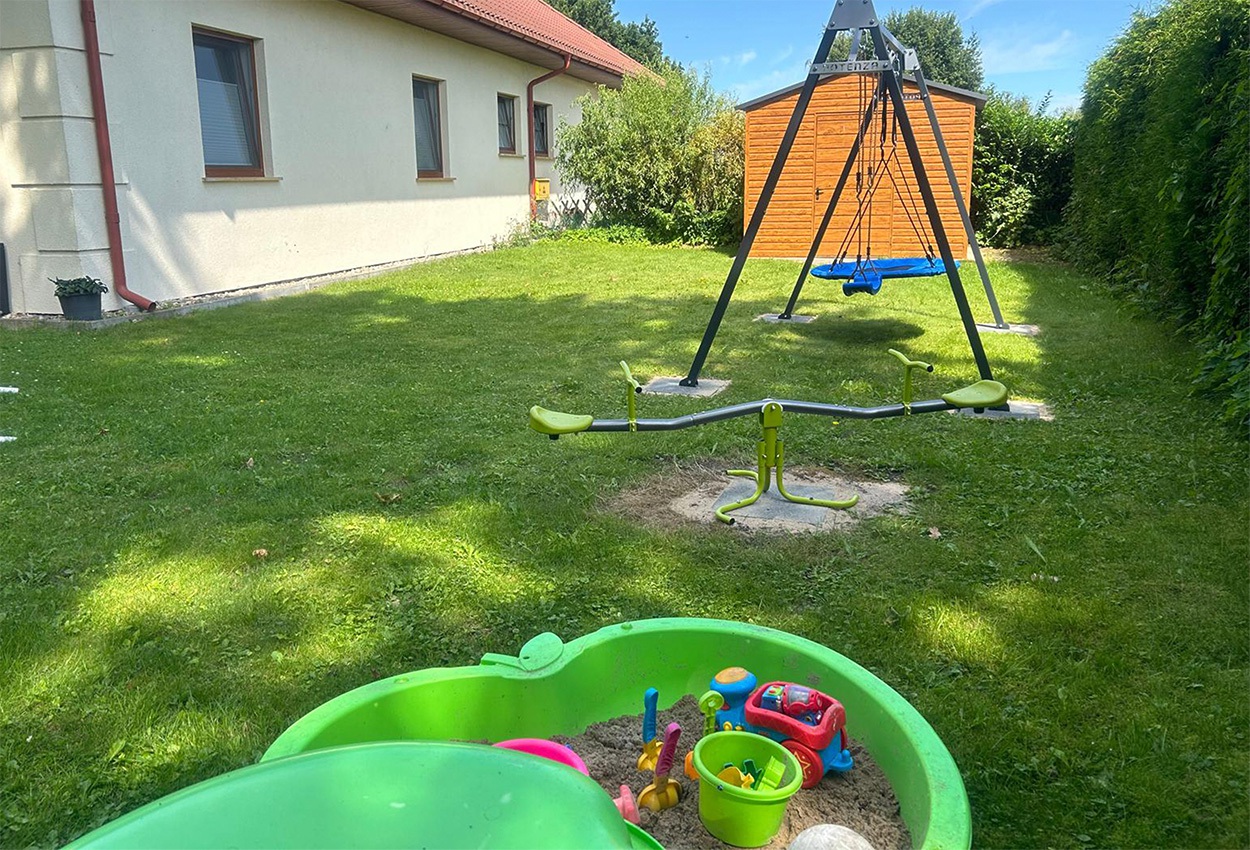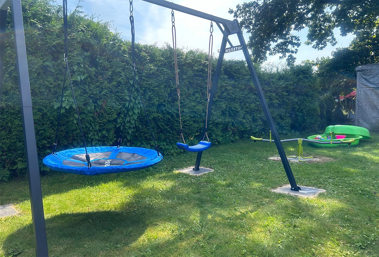 Sandkasten, Schaukel und Federballnetz für die kleinen Gäste