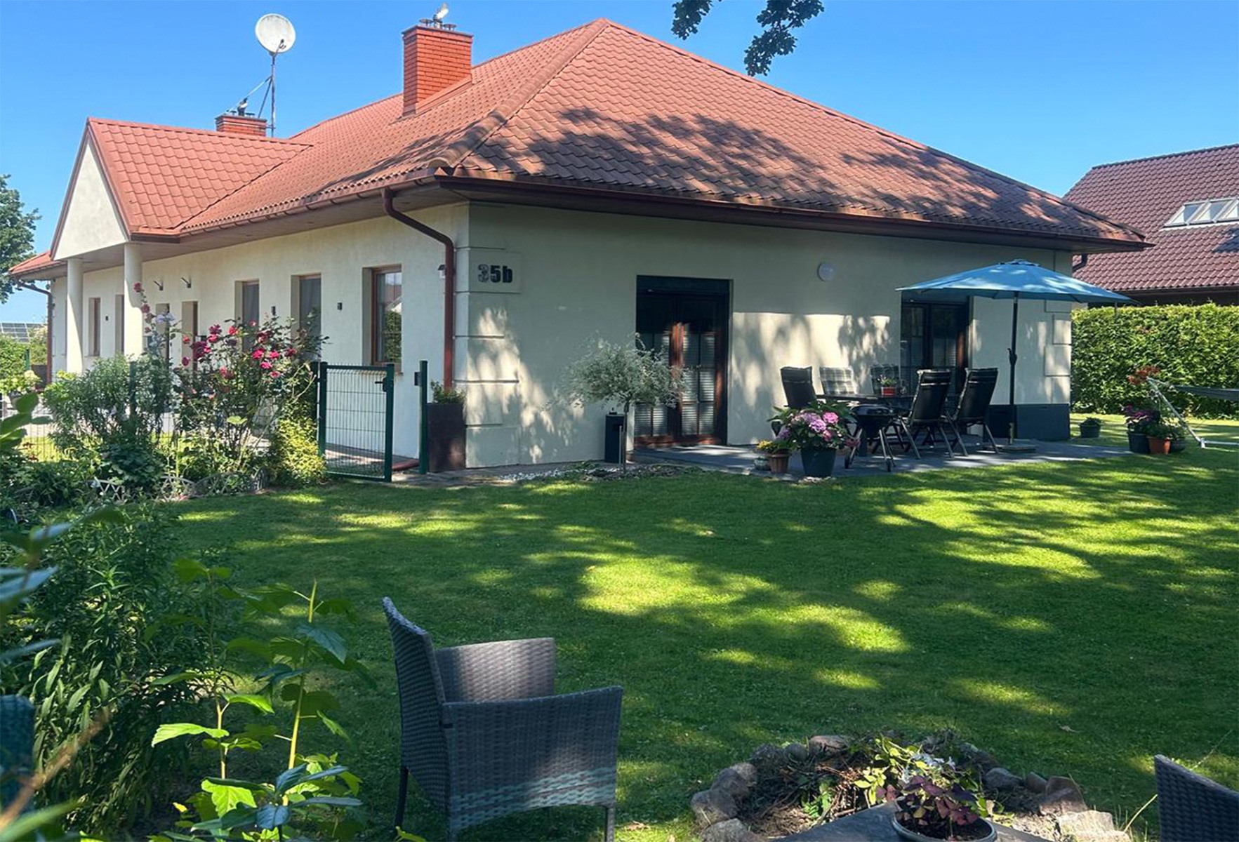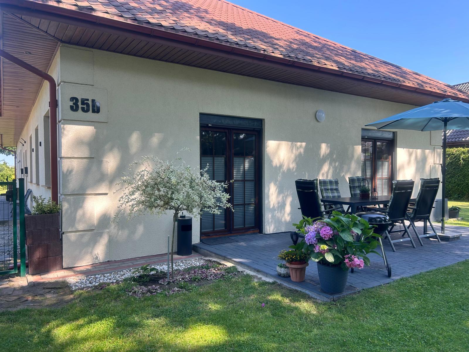 Die Ferienwohnung hat eine gute Lage und verfügt über zwei Schlafzimmer, eine vollausgestattete Küche, ein Badezimmer inklusive Handtücher, ein Wohnzimmer mit Schlafcouch und einen großen umzäunten Garten mit Grillmöglichkeit.